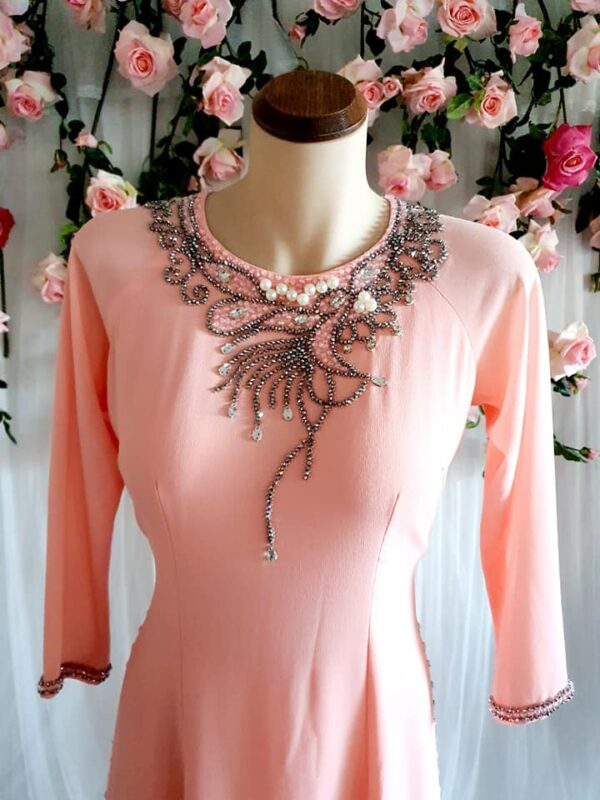 Be the first to review “Tu Trinh – Peach with Gemstones and Pearls Embellishment”